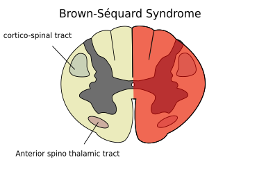 By Fpjacquot - Self-published work by Fpjacquot, CC BY-SA 3.0, https://commons.wikimedia.org/w/index.php?curid=1021672 Incomplete lesions of the spinal cord: Central cord syndrome (top), Anterior cord syndrome (middle), and Brown-Séquard syndrome (bottom). Fpjacquot - Self-published work by Fpjacquot a schematic diagram showing anatomical signification of uncomplete cord injuries